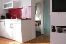 Gemütlicher Wohn-Schlafbereich mit angrenzender offener Küchenzeile, komfortables Naturstein-Duschbad
